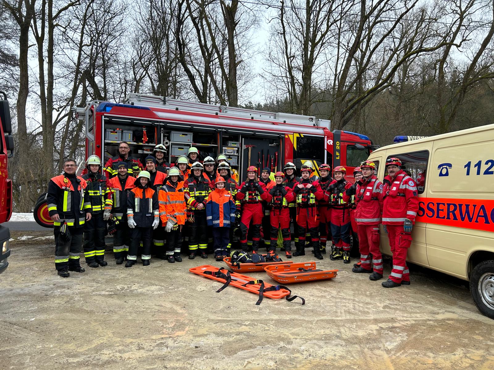 Vergangenen Samstag trainierten wir zusammen mit der Feuerwehr Auerbach, eine eingebrochene Person aus dem Eis zu retten. Sowohl unser Material, wie der Eisrettungsschlitten, als auch Drehleiter, Schleifkorbtrage, Steckleiterteile sowie Spineboard der Feuerwehr kamen zum Einsatz.